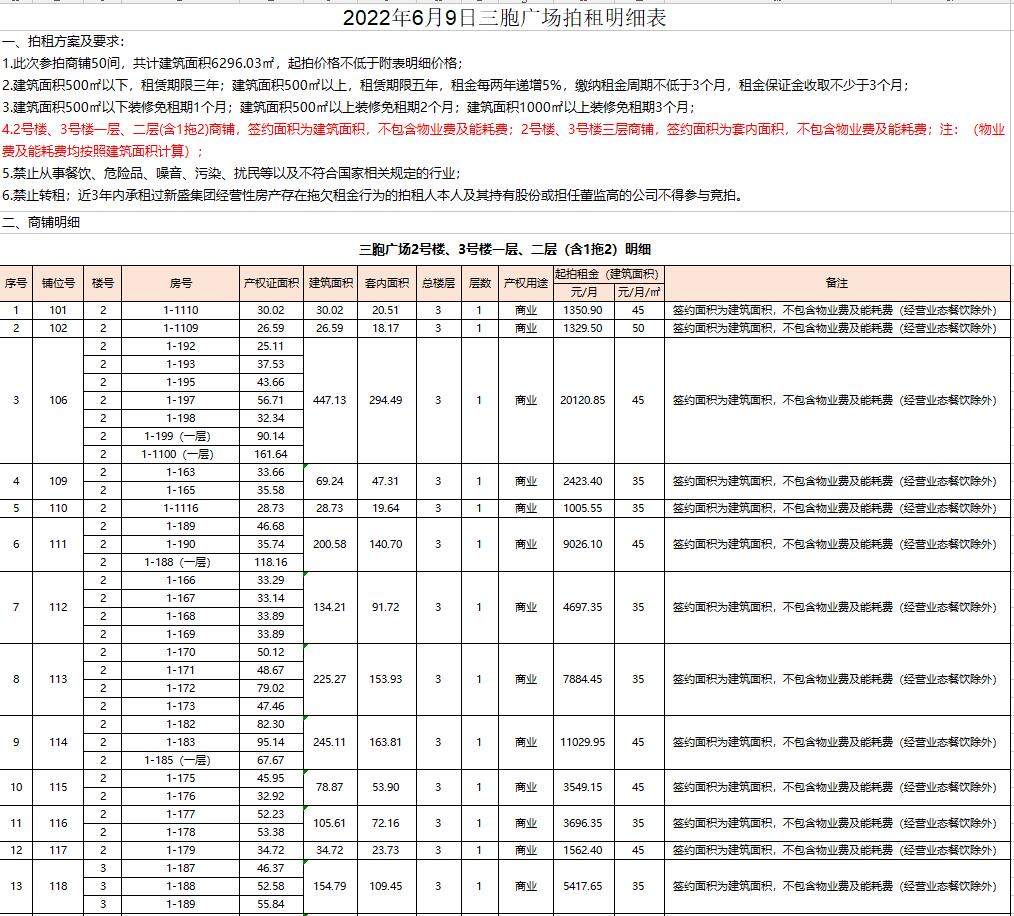 即日起展示。詳情請登錄本公司網(wǎng)站或微信公眾號查詢。有意者請攜帶有效證件至我公司報(bào)名,并交納每間商鋪1萬元保證金即可參拍,報(bào)名截止至6月8日16時(shí)。
