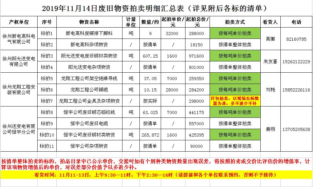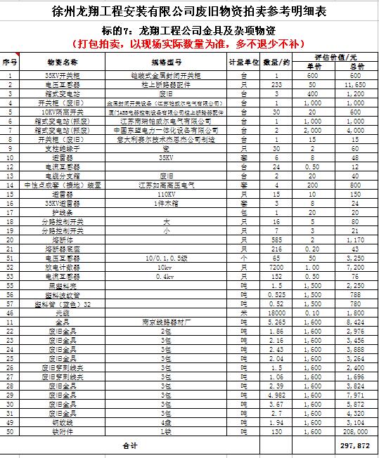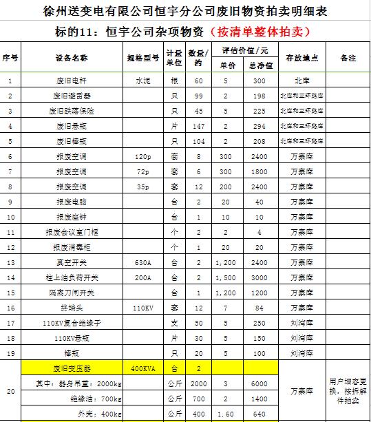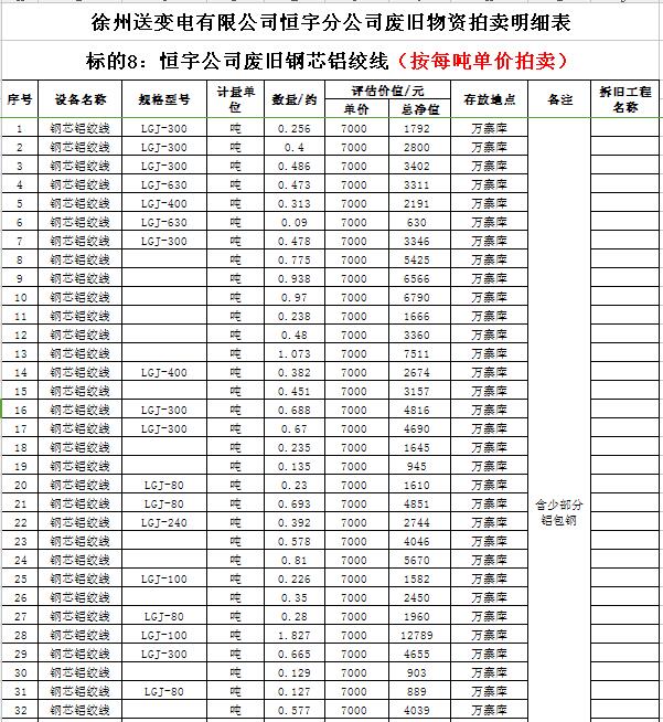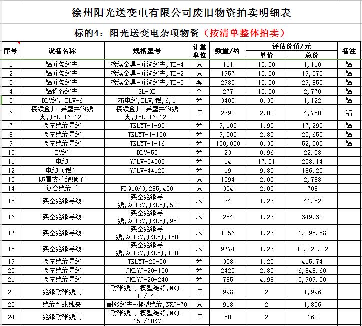 關(guān)注微信公眾號(hào)受委托,我公司將通過(guò)中國(guó)拍賣行業(yè)協(xié)會(huì)網(wǎng)絡(luò)拍賣平臺(tái)以網(wǎng)絡(luò)競(jìng)價(jià)的方式公開(kāi)拍賣以下公司廢舊電力物資。主要包含:廢銅排下腳料、廢不銹鋼、辦公設(shè)備等;架空絕緣導(dǎo)線、電纜、金具、角鋼塔、鋼芯鋁絞線、開(kāi)關(guān)、互感器、變壓器散件等。