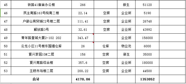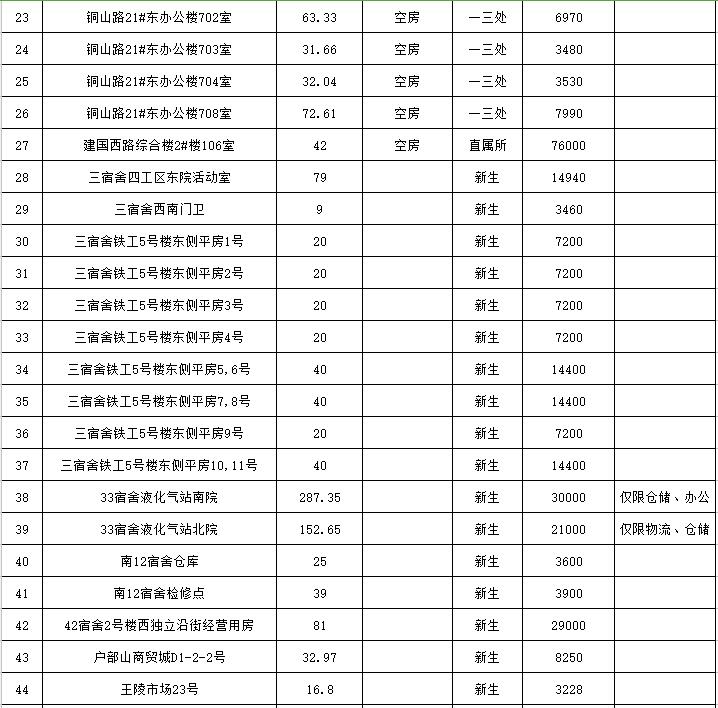 位于銅山路21#辦公房屋15處;位于建國西路2號樓辦公房屋5處;位于鐵路3宿舍10處、33宿舍2處、南12宿舍2處、41-42宿舍2處,其他分別位于王陵市場、復(fù)興南路、戶部山商貿(mào)城、皇城大廈、解放路3號、南門橋綜合樓等地。