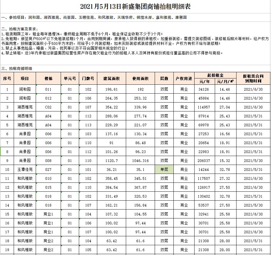 關(guān)注微信公眾號我公司受委托,定于2021年5月13日9:30時在徐州市中山南路55號本公司拍賣廳公開拍租以下商鋪:湖西雅苑14間、嘉和雅苑3間、尚景園11間、玉潭佳苑4間、紫荊園2間、康馨園3間、楓情水岸2間、潤和園3間、天瑞華府1間、和風(fēng)雅致21間。面積分別約為數(shù)十至三百余平米不等,租期均為三年。