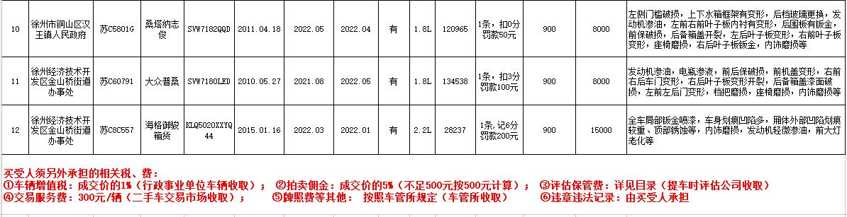 7月13日、14日在徐州銀地二手車交易市場展示。有意競買者請持有效證件到我公司辦理報(bào)名手續(xù),并交納每輛車1萬元保證金即可參拍,報(bào)名截止至7月14日16時(shí)。